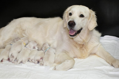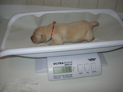 Gleich nach der Geburt werden die Kleinen gewogen und erhalten ein farbiges Halsband. So können wir die Gewichtszunahme von Anfang an dokumentieren und so sicherstellen, daß ein jeder Welpe optimal versorgt wird. |