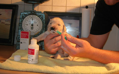 Bähh! Die erste Wurmkur. Nicht wirklich lecker, aber unabdingbar. Diese Schluckimpfung müssen unsere Welpen aller 14 Tage über sich ergehen lassen. Zum Trost wechselt unser Tierarzt öfter einmal das Präparat, damit sich auch wirklich keiner der ungewollten Untermieter bei den Kleinen einnisten kann.